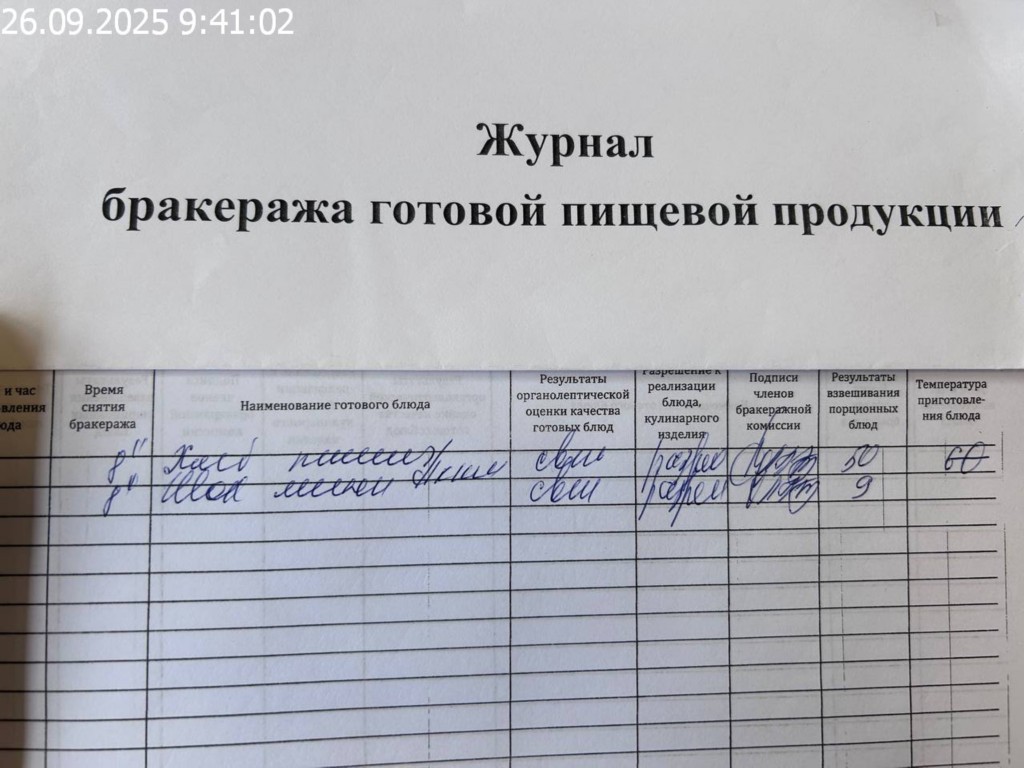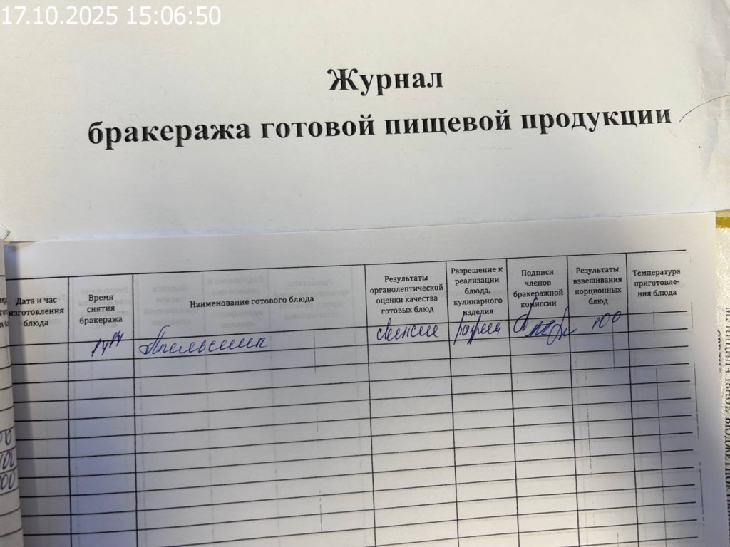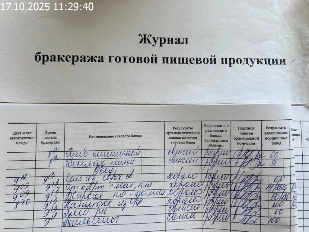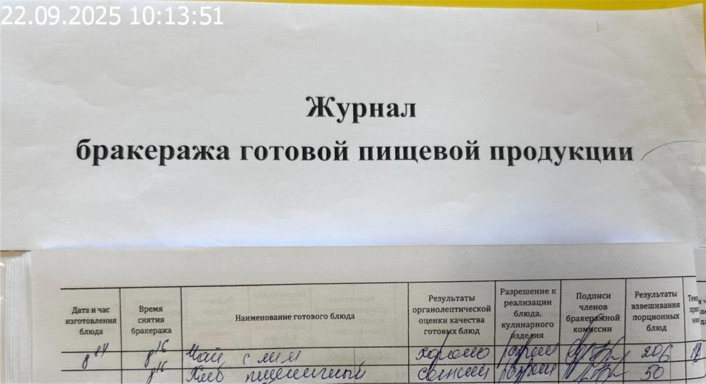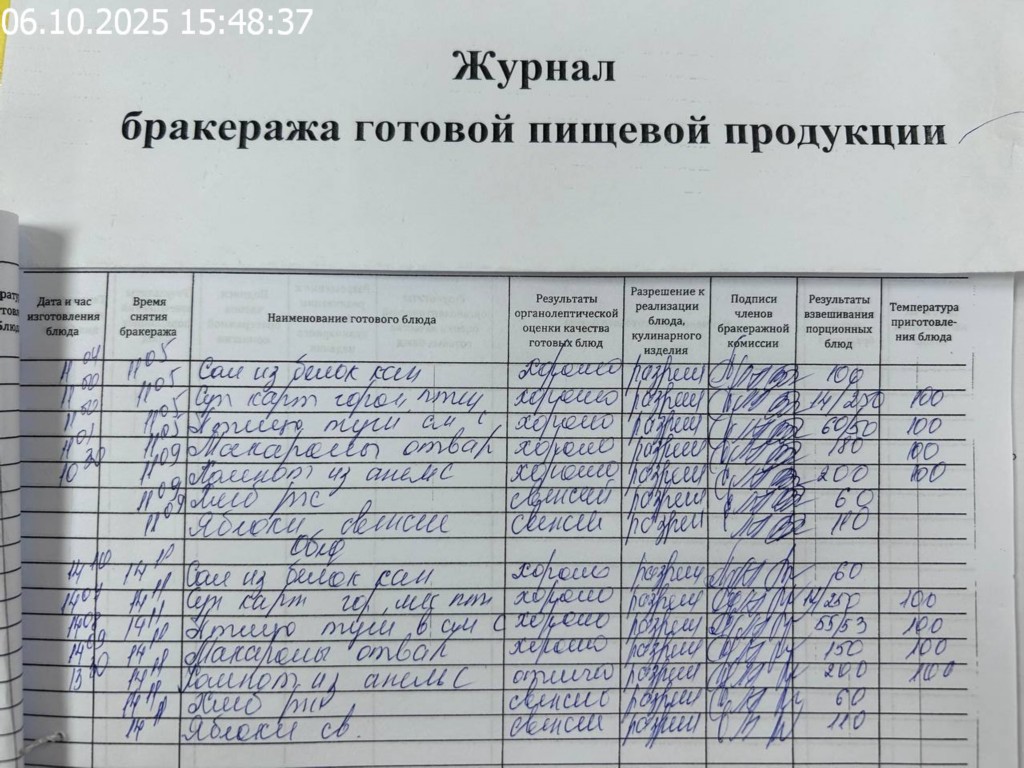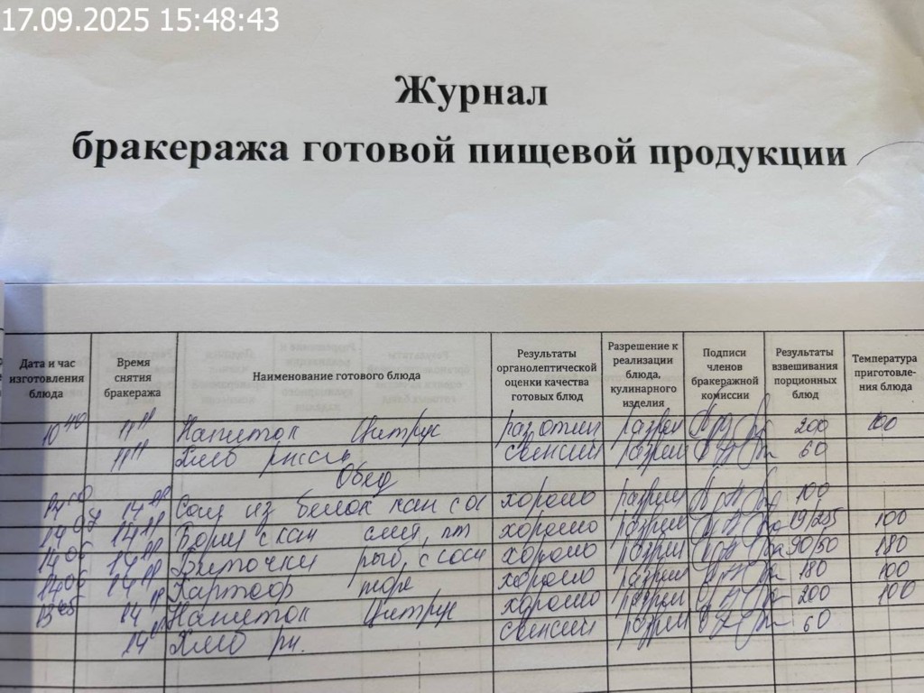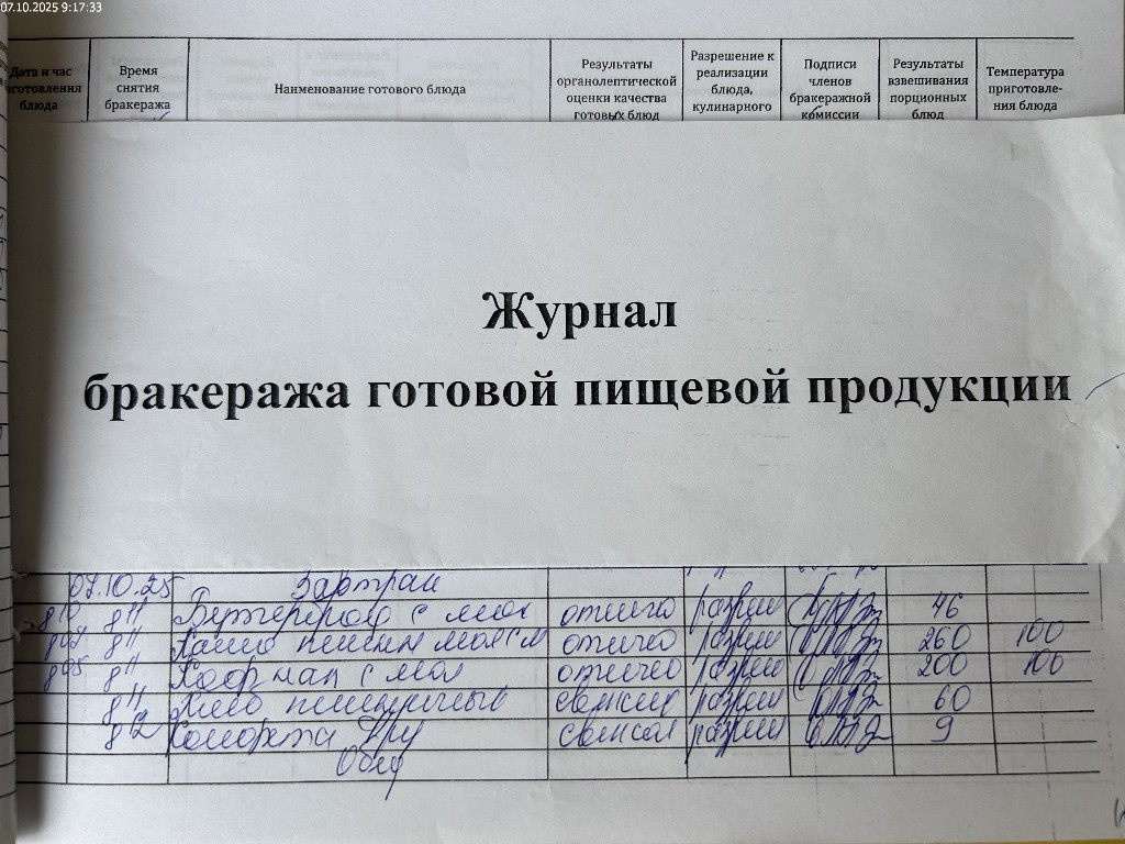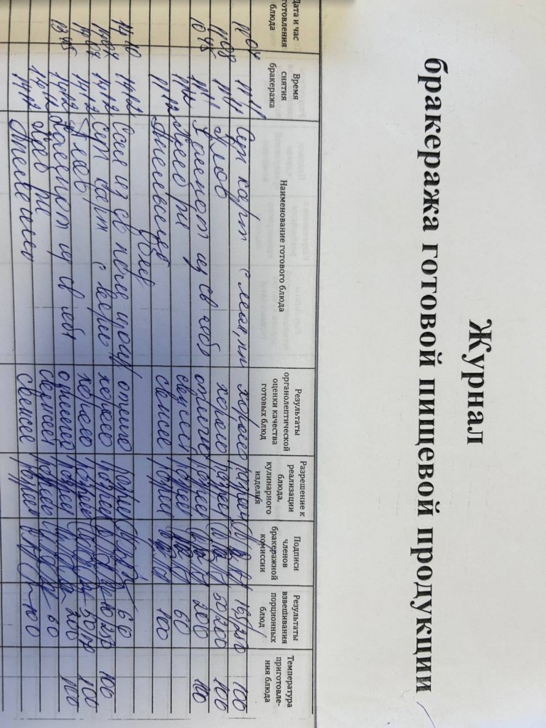 Журнал бракеража готовой пищевой продукции